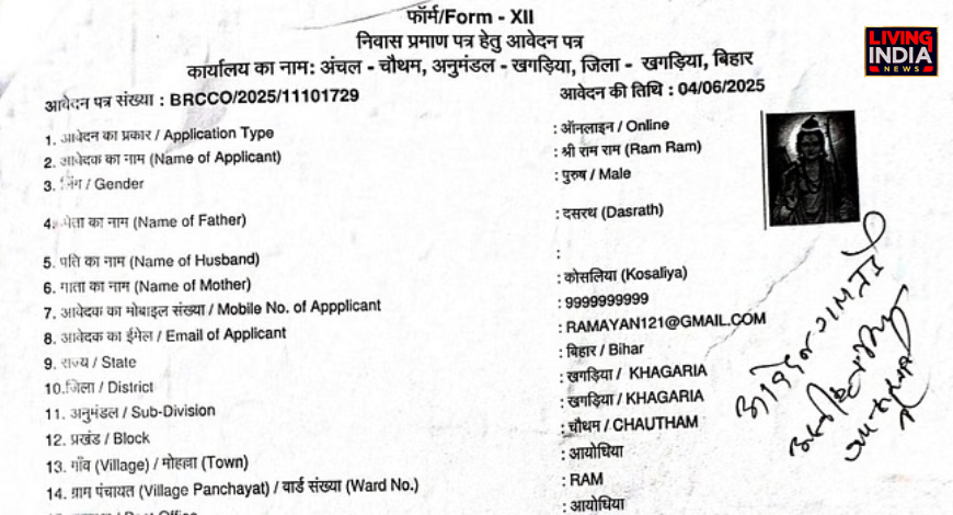 बिहार में ऑनलाइन आवासीय प्रमाणपत्र बनाने के अजब मामले सामने आ रहे हैं. डॉग बाबू के नाम से ऑनलाइन निवास प्रमाणपत्र बनने का मामला के बाद, अब खगड़िया जिले के दो अलग-अलग अंचल कार्यालयों में कौवा और भगवान राम व माता सीता के नाम से निवास प्रमाणपत्र बनाने का ऑनलाइन आवेदन आया है. इन आवेदनों के फोटो वाले जगहों पर कौआ, भगवान राम और माता सीता की तस्वीर हैं. स्थानीय प्रशासन के संज्ञान मामला आने के बाद तीनों आवेदनों को अस्वीकृत कर दिया गया है और अज्ञात के खिलाफ चित्रगुप्त नगर थाना और चौथम थाना में केस दर्ज किया गया है.