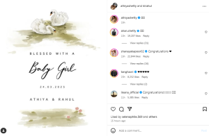 बच्ची का जन्म सोमवार को हुआ क्योंकि एक तस्वीर में “24-03-2025” लिखा है. सुनील शेट्टी की बेटी अथिया और राहुल ने बिना कुछ लिखे तस्वीर साझा की, लेकिन एक हैलो और पंखों वाले बच्चे का आइकन जोड़ा, यह उनका पहला बच्चा है.